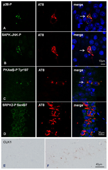 Double-labeling immunofluorescence and confocal microscopy to p38-P Thr180/Tyr182 or SAPK/JNK-PThr183/Thr185 (green), and AT8 (red) in inoculated hTau at the age of six months and killed at the age of nine months shows co-localization of the active kinases with phospho-tau deposition (white arrows) (A and B, respectively for p38-P and SAPK-JNK-P) in dentate gyrus neurons. Double-labelling immunofluorescence and confocal microscopy to PKAα/β-P Tyr197 and AT8 in inoculated hTau mice shows cytoplasmic granular PKAα/β-P Tyr197 granules in CA1 neurons with abnormal phospho-tau deposits in neurons (C, arrow). Cytoplasmic SRPK2-Ser497 immunoreactivity is found in neurons with phospho-tau deposits in inoculated hTau mice (D). Paraffin sections, nuclei are stained with DRAQ5™ (blue), A, B, bar = 10 µm, C and D, bar = 20 µm. CLK1 immunoreactivity in the CA1 region of non-inoculated (E) and inoculated hTau with AD sarkosyl-insoluble fractions (F); small cytoplasmic granules are seen in inoculated hTau. Paraffin sections, slightly counterstained with haematoxylin, bar = 40 µm.