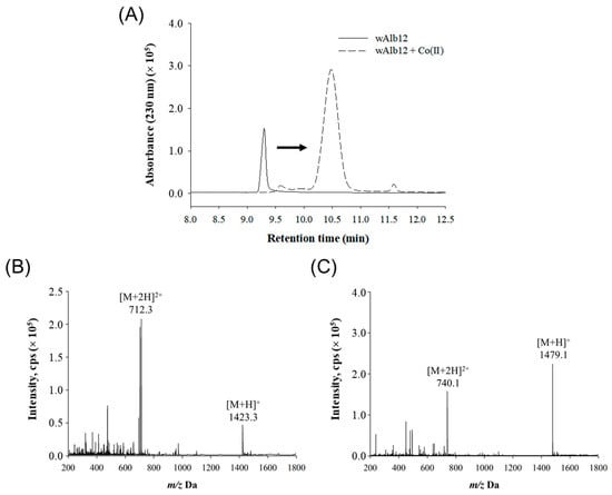 Co(II) binding to wAlb12 was confirmed by evaluating the change in the retention time and molecular weight during the LC-MS analysis (Figure 5). The samples comprised 0.5 mM wAlb12 alone and 0.5 mM wAlb12 mixed with 0.5 mM CoCl2 at a 1:1 ratio. As observed with HPLC, the retention time of wAlb12 was approximately 9.3 min and the wAlb12 + Co(II) mixture migrated to the right with a retention time of 10.5 min. Moreover, under this condition, wAlb12 + Co(II) tended to show an approximately two-fold increase in absorbance and an increased peak area (Figure 5A). ESI-MS analysis of wAlb12 alone showed the expected values, namely 1423.3 m/z corresponding to [M + H]+ and 712.3 m/z corresponding to [M + 2H]2+ (Figure 5B). After the addition of CoCl2, wAlb12 + Co(II) exhibited increased m/z values, namely 1479.1 m/z corresponding to [M + H]+ and 740.1 m/z corresponding to [M + 2H]2+ (Figure 5C). Accordingly, when Co(II) was bound to wAlb12, the molecular weight increased to approximately 56 with the loss of two protons. An increased molecular weight of the complex resulted in a lower Co(II) molecular weight as two hydrogen ions were removed from the peptide for binding [28]. These results indicate that Co(II) bound to wAlb12, which resulted in increased mass spectrum values for wAlb12.