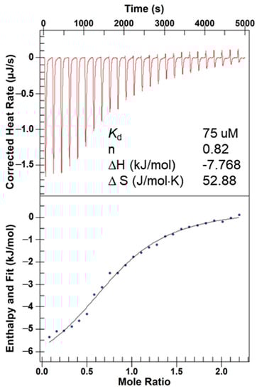 The binding affinity between wAlb12 and Co(II) was determined by ITC. The wAlb12 bound Co(II) with Kd of 75 μM when analyzed by a single-site binding model. The stoichiometry of the interaction was 0.82 (n) (Figure 6). In previous reports, the dissociation constant for Co(II) ion binding to the N-terminal sequence (NTS) of HSA was 110 μM [35,36], which is similar to our data. For other metal ions, the dissociation constants for Cu(II) and Ni(II) binding to the NTS of HSA were 1 pM and 150 nM, respectively. These indicate that Co(II) is a relatively low-affinity transition metal ion to the HSA. We could not obtain appropriate Kd values at different pH and temperature conditions because the heat changes were uneven and weak (Figure S3).