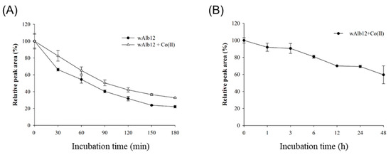 To confirm the proteolytic stability of wAlb12 and wAlb12 + Co(II), the peptides were incubated with trypsin for 3 h at 37 °C, following which HPLC was performed (Figure 7A). In the case of wAlb12, up to 66% of the peptides were not degraded after 30 min. In the case of wAlb12 + Co(II), 82% of the complex was not degraded after 30 min. At 180 min, up to 22% of wAlb12 remained; however, with wAlb12 + Co(II), 33% of the complex remained because of the binding of the peptide to Co(II). As Co(II) was bound to wAlb12, wAlb12 degraded slowly, and the stability of this complex was approximately 10% or higher compared to wAlb12. The results showed that wAlb12 + Co(II) had increased proteolytic stability. The structural change of wAlb12 after binding to Co(II) made it difficult for trypsin to selectively interact with it, resulting in lower levels of degradation than those observed for wAlb12.