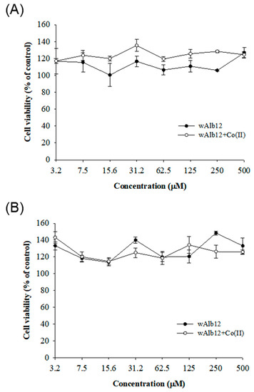 For use in drugs or diagnostic agents administered to humans, the wAlb12 + Co(II) complex must be nontoxic to host cells. Therefore, we assessed the cytotoxicity of wAlb12 and wAlb12 + Co(II) in vitro (Figure 8). wAlb12 and wAlb12 + Co(II) were not cytotoxic to RAW 264.7 cells at 0.5 mM concentrations (Figure 8A). The wAlb12- and wAlb12 + Co(II)-treated cells displayed increased cell viability compared to those in the control medium. Thus, the cell viability constant was maintained at more than 100% at all concentrations. Likewise, the two compounds were also non-toxic to HEK 293T cells (Figure 8B). The results showed that wAlb12 and wAlb12 + Co(II) are neither toxic to RAW 264.7 or HEK 293T cells.