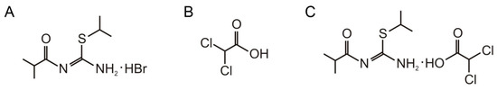 Structural formulas of the compounds studied. (A) 1-isobutanoyl-2-isopropylisothiourea hydrobromide (compound T1023); (B) dichloroacetate (DCA); (C) 1-isobutanoyl-2-isopropylisothiourea dichloroacetate (compound T1084).