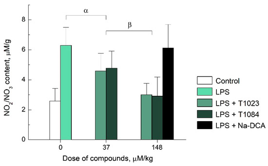 Effect of T1023 and T1084 with a single i.p. administration at equimolar doses of 37 µM/kg (10.0 and 11.8 mg/kg, respectively); and T1023, Na-DCA, T1084 at equimolar doses of 148 µM/kg (40.0, 22.2 and 47.1 mg/kg, respectively) on LPS-induced production of NO2/NO3 in liver tissue of male mice F1 (CBA × C57Bl/6j) (see Materials and Methods). Graphical deviations correspond to SD (n = 24–27 per point). Significant intergroup differences are marked with α and β. α—between the group receiving only LPS and the groups receiving T1023 and T1084 at a dose of 37 µM/kg (T1023: p = 0.00673; T1084: p = 0.00914, respectively); β—between the groups receiving NOS inhibitors at a dose of 37 and 148 µM/kg (T1023: p = 0.00257; T1084: p = 0.01846, respectively).