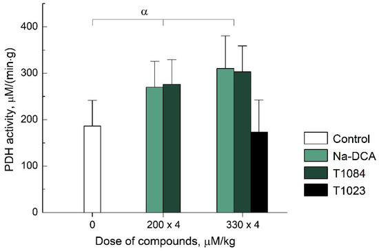 Effect of Na-DCA and T1084, 4-fold i.g. administration at equimolar doses of 200 µM/kg (30 and 63 mg/kg, respectively) and Na-DCA, T1084 and T1023, 330 µM/kg (50, 105 and 89 mg/kg, respectively), on PDH activity in male CBA mouse liver tissue (see Materials and Methods). PDH activity—rate of pyruvate oxidation in homogenate, μM/(min·g). Graphical deviations correspond to SD (n = 11–13 per point). α—significant differences with control animals (Na-DCA: p = 0.03324, p = 0.00409; T1084: p = 0.01298, p = 0.00442, respectively).