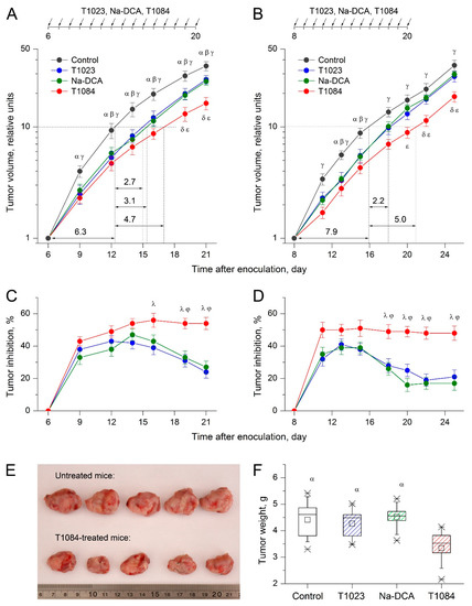 Effect of T1023, Na-DCA, and T1084 with chronic i.p. administration at equimolar doses 220 µM/kg (60.0, 33.6, and 70.7 mg/kg, respectively) on solid Ehrlich carcinoma (SEC) in female mice F1(CBA × C57Bl/6j). Data from two independent experiments ((A,C)—first; (B,D–F)—second). (A,B)—tumor growth curves in animal groups (n = 17–21 per point). Tumor volume (TV) indices for each animal are normalized to the initial volume on the day of the beginning of treatment. Graphical deviations correspond to SD. Dotted lines—estimates of the duration of tumor growth retardation (in days) by the time of a 10-fold increment in TV. Symbols—significant TV differences: α—in control mice vs. T1023-treated mice; β—in control mice vs. Na-DCA-treated mice; γ—in control mice vs. T1084-treated mice; δ—in T1084-treated mice vs. T1023-treated mice; ε—in T1084-treated mice vs. Na-DCA-treated mice. Significance of differences: α—(A) p = 0.0082, p = 0.0058, p = 0.0079, p = 0.0119, p = 0.0091, p = 0.0238; (B) p = 0.0054, p = 0.0098; β—(A) p = 0.0103, p = 0.0028, p = 0.0053, p = 0.0066, p = 0.0158; (B) p = 0.0084, p = 0.0068; γ—(A) p = 0.0052, p = 0.0006, p = 0.0001, p = 0.0001, p = 0.0002, p < 0.0001; (B) p = 0.0038, p = 0.0012, p = 0.0002, p = 0.0026, p = 0.0034, p = 0.0003, p = 0.0002; δ—(A) p = 0.0205, p = 0.0008; (B) p = 0.0102, p = 0.0094; ε—(A) p = 0.0136, p = 0.0112; (B) p = 0.0074, p = 0.0057, p = 0.0069. (C,D)—dynamics of tumor growth inhibition (TI) in animal groups. Graphic deviations correspond to SD. Symbols—significant TI differences: λ—in T1084-treated mice vs. T1023-treated mice; φ—in T1084-treated mice vs. Na-DCA-treated mice. Significance of differences: λ—(C) p = 0.0133, p = 0.0071, p = 0.0038, (D) p = 0.0083, p = 0.0070, p = 0.0024, p = 0.0045; φ—(C) p = 0.0098, p = 0.0051, (D) p = 0.0075, p = 0.0013, p = 0.0022, p = 0.0034. (E) Appearance of SEC tumor nodes on the 25th day after inoculation in untreated and T1084-treated mice. (F) Weight of SEC tumor nodes on the 25th day after inoculation in untreated, T1023-treated, DCA-treated, and T1084-treated mice (n = 17–20). Symbol α—significant tumor weight differences vs. T1084-treated mice. α—p = 0.007045, p = 0.0122276, p = 0.001116.