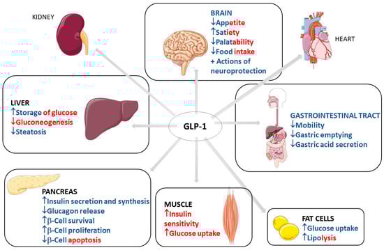 GLP-1 has biological effects that are well known and well established in clinical medicine. These effects occur through the binding to GLP-1 receptors in multiple organs and body systems. GLP-1 action in the pancreas includes an increase in insulin secretion and synthesis, an increase in pancreatic β-cell proliferation and β-cell survival, and a decrease in glucagon release. This scenario leads to reduced gluconeogenesis and increased hepatic storage of glucose as glycogen. Other actions include increased glucose uptake by muscle cells and increased glucose uptake and increased lipolysis in adipocytes. GLP-1 can also reduce appetite, gastrointestinal motility, and gastric acid secretion. The actions of GLP-1 in the kidney include mild natriuresis. GLP-1 increases contractility and heart rate in the heart and has vascular protective effects. Due to these metabolic effects of GLP-1, it is primarily used in clinical practice to treat type 2 diabetes mellitus (T2DM) and obesity [,,,,,,]. Figure 1 shows the most important traditional organ targets for GLP-1 activities and its actions on each target, with direct and indirect effects differentiated by color.