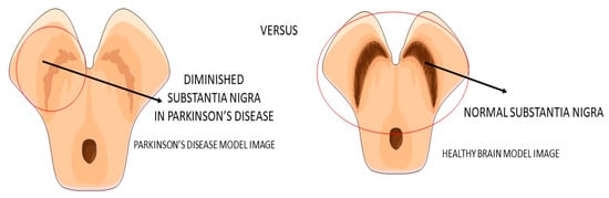 Parkinson’s disease (PA) is a progressive neurodegenerative disease (Figure 4) characterized predominantly by motor signals, such as tremor, akinesia, and bradykinesia. However, nonmotor symptoms and signs can also be found, such as cognitive decline, depression, signals of anxiety, sleep disturbances, and dysautonomia. It is a common neurologic ailment that affects 1.5% of individuals over 65 years old worldwide. In Parkinson’s, midbrain neurons are degenrated mainly because of mitochondrial dysfunctions that lead to cellular energy failure and, consequently, to a reduction of dopamine transmission and deposition of α-synuclein, in addition to the presence of increased oxidative stress. The deposition of a-synuclein, accumulation of reactive oxygen species (ROS), and the presence of dying neuron cells trigger an inflammatory environment in the midbrain tissue. The process leads to degeneration of the brain, together with autophagy and apoptosis. The gold standard treatments are dopamine replacement with dopaminergic medications or brain stimulation. These treatments improve the motor signals, but they are only partially effective due to the progressive nature of Parkinson’s. Subsequently, the non-dopaminergic systems will be involved in the progression of the disease, causing some nonmotor symptoms, for instance, depression and cognitive decline [,,].