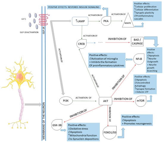 The beneficial actions of GLP-1 go far beyond insulin secretion and appetite and include cardiovascular benefits and possibly also beneficial effects in neurodegenerative diseases. GLP-1 presents neurotrophic and neuroprotective effects demonstrated by some clinical trials studies and mouse model studies. It can cross the blood–brain barrier and central nervous system and may influence some neural actions in cellular pathways, such as neuroinflammation, mitochondrial dysfunction, and cellular proliferation. For example, the decontrolled mitochondrial functions may lead to cellular energy failure. This procedure is implicated as the leading cause of dopaminergic neuron death in Parkinson’s disease and other age-related neural dysfunction. Studies in animal models suggested that activating the GLP-1 receptors (GLP-1Rs) in the brain improves neuroinflammation, neurogenesis, and synaptic plasticity. The neurotrophic and neuroprotection promoted by GLP-1 might explain the improvements in the neuronal activities and the interference in neurodegenerative pathways, which means that GLP-1 could protect against diseases such as Alzheimer’s and Parkinson’s [,,].