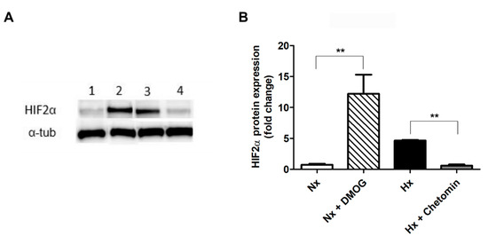 Expression of HIF2α protein is increased under hypoxic conditions. (A) GSCs were cultured under different conditions, and the HIF2α expression was analyzed by Western blot in total cell lysates (a representative image is shown). 1: normoxia; 2: normoxia + DMOG; 3: hypoxia; 4: hypoxia + chetomin. (B) Image band quantification by using ImageJ analysis software. Nx: normoxia; Hx: hypoxia. Data were normalized to α-tubulin levels. ** p < 0.01. Bars represent mean ± SEM of three independent experiments.
