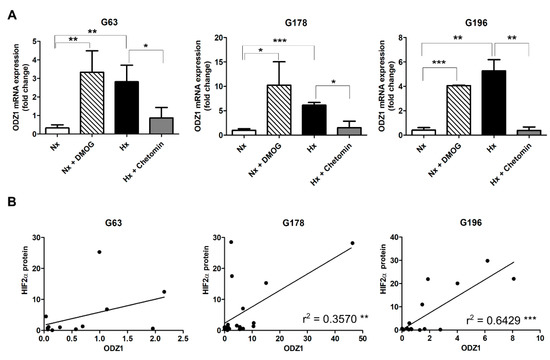 Expression of HIF2a mRNA correlates with ODZ1 mRNA levels. (A) GSC cell lines were cultured under hypoxia, and the expression of HIF2α mRNA was analyzed by qPCR. Data were normalized to G6PD levels. * p < 0.05, ** p < 0.01, *** p < 0.001. Bars represent mean ± SEM of three independent experiments. (B) Correlation between ODZ1 mRNA and HIF2α mRNA. Pearson’s coefficient (r); p < 0.001.