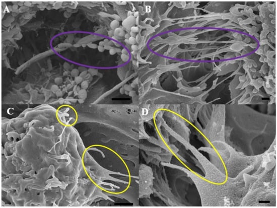 HR-SEM micrographs representing BEC bEnd5 NTs that are subdivided into two types: (A) NV-induced TUNTs indicated by the purple circles, scale bar 1000 nm; (B) TUNT formation and extension across the PC space between adjacent BECs, upon the fusion of multiple NVs, scale bar = 300 nm; (C) TENTs formed by the BEC membrane leading edges as indicated by the yellow circles, scale bar = 1000 nm; (D) A magnified TENT extension across the PC space between two adjacent BECs forming an occluded tent-like covering, scale bar = 300 nm.