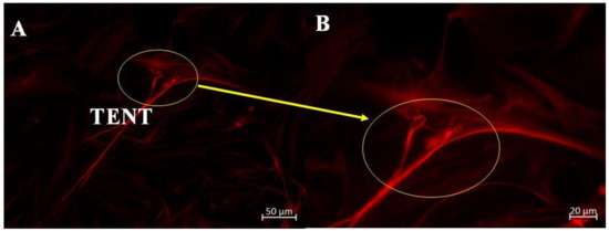 Alexa Fluor 568-stained α-tubulin of a non-treated bEnd3 cell. (A) α-tubulin interaction of cells, displaying the intramolecular profile of TENTs; (B) The magnification of the interaction of these α-tubulin-based TENT extending between the BECs membranes as indicated by the yellow circles.