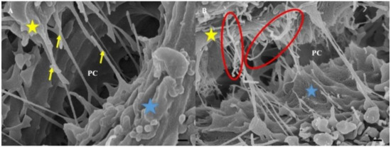 HR-SEM micrographical representation of the morphological deformation of cell-cell connections between adjacent BECs upon Nocodazole-induced cytoarchitectural depolymerization. (A) The bEnd5 TENT formation with cells that were grown in standard culture medium. The yellow arrows show the normal nature of PC TENTs, reflecting their bearing and tautness; (B) The effect of nocodazole exposure on bEnd5 NT formation relative to the control. The yellow star represents cell 1, the blue star represents cell 2, and the paracellular space is denoted by PC. The red circles in (B) indicate NTs which have lost their tautness and demonstrate the recoiling of TENTs in the Nocodazole-treated bEnd5 cell cultures.