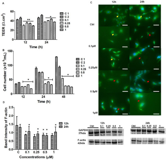 The effect of known depolymerizing agent Cytochalasin D on the physiological parameters of BECs. (A) The effect of 0.1–1 μM Cytochalasin D on the TEER across the confluent monolayers of bEnd5 BECs after 12–24 h exposure. The single asterisk * represents significant differences between the experiments and the control samples. The double asterisk (**) denotes statistical significance between the experimental samples and the vehicle control 2 (C2). The data are expressed as the mean ± SEM; (B) represents the effect of Cytochalasin D on bEnd5 cell numbers. The asterisks * denotes statistically significant differences between the experimental samples relative to control 1 (C1) and the vehicle control 2 (C2- with 0.1% DMSO); (C) Assessing the depolymerizing effect of Cytochalasin D in IF micrographs of Alexa Fluor 488 conjugated, monoclonal F-actin antibodies (Ab’), the yellow arrowheads indicate the regions of NT formation and the red arrowheads indicate the regions of depolymerization and/or intercellular gaps at the membrane leading edges between adjacent BECs, 12 h and 24 h. D (Scale bar = 50 μM) (D) Western blot analysis displays the effect of chemical perturbation of Cytochalasin D on F-actin expression. The asterisks * denotes statistically significant differences between the experimental samples and both control 1 and 2. The data are represented as the mean ± SEM (n = 3). Statistical significance was determined at p < 0.05.