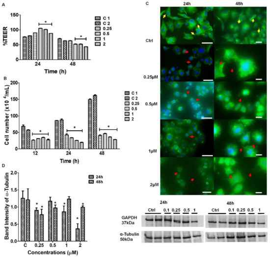To investigate whether α-tubulin played a role in maintaining the permeability status across the BEC monolayers, confluent monolayers of bEnd5 cells were treated with selected concentrations of Nocodazole. Figure 7A shows an increase in TEER across a confluent monolayer of bEnd5 BECs at 24 h, relative to the untreated samples. Conversely, a slight dose-related effect was evident at 48 h with a decrease in TEER upon increasing doses of Nocodazole. In Figure 7B, significant suppression in cell numbers was observed from 12–24 h across all concentrations of Nocodazole (0.25–2 μM) (p < 0.001), relative to the control samples. Figure 7C showed that the α-tubulin-rich population aligned along the leading edges of the BEC plasma membrane in untreated samples (controls), with effective cell-cell interaction (see the yellow arrows). Comparatively, the cells that were treated with Nocodazole did not exhibit α-tubulin alignment along the BEC membranous leading edges, but rather produced disorganized thread-like structures that were caused by depolymerization treatment. The depolymerization was more effective along the peripheral edges of the BEC plasma membrane (see the red arrows) (Figure 7C). The untreated samples displayed less pronounced polymerization at the cell center and an accumulation of α-tubulin around the nucleus. In Figure 7D, although the study was repeated in triplicate, there was no clear pattern of dose-related suppression in α-tubulin. The suppression of α-tubulin that was, however, observed relative to the control samples at 24–48 h (p < 0.0006), directly correlated with increasing concentrations of Nocodazole (p < 0.0016).