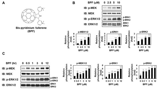 A bis-pyridinium fullerene derivative enhanced the activation of the MEK-ERK pathway in K562 cells. (A) Structure of the bis-pyridinium fullerene derivative (BPF). (B) K562 cells were treated with BPF (2.5, 5, and 10 μM) for 6 h. (C) K562 cells were treated with BPF (5 μM) for the indicated periods. (B,C) The phosphorylation and/or expression of MEK and ERK were detected by immunoblotting. The relative phosphorylation levels of MEK, ERK1, and ERK2 are shown in the graphs. * p < 0.05, ** p < 0.01, and *** p < 0.001 indicate a significant difference from control cells.