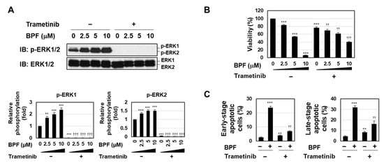 Trametinib is a highly specific and potent MEK inhibitor [22]. To clarify the functional involvement of the MEK-ERK pathway in BPF-induced apoptosis in K562 cells, we analyzed the effects of trametinib on BPF-induced apoptosis. The treatment with trametinib inhibited the phosphorylation of ERK in untreated K562 cells and K562 cells treated with BPF (Figure 3A). The viability of trametinib-treated K562 cells was slightly reduced; however, the pretreatment with trametinib attenuated BPF-induced cytotoxicity, suggesting that the MEK-ERK pathway possesses bidirectional functions for cell survival (Figure 3B). Since we previously confirmed that BPF triggered apoptotic cell death [20], we performed an annexin-V/PI analysis in the present study. Although the treatment with trametinib slightly increased the population of early and late apoptotic cells in K562 cells, BPF-induced increases in the populations of early and late apoptotic cells were significantly reduced by the treatment with trametinib (Figure 3C). These results suggest that the BPF-induced activation of the MEK-ERK pathway was involved in the induction of apoptosis in K562 cells (Figure 3C).
