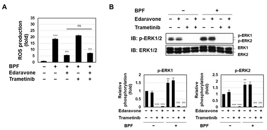 We subsequently investigated the relationship between ROS generation and the activation of the MEK-ERK pathway in BPF-induced K562 cell death using the potent free radical scavenger edaravone [23] and trametinib. Measurements of intracellular ROS levels using a DCFH-DA probe showed that they were strongly induced by BPF in K562 cells. Edaravone effectively suppressed BPF-induced ROS generation, whereas trametinib had no effects. In addition, the inhibition of ROS generation by edaravone was not affected by the co-treatment with trametinib (Figure 4A). The enhancement of MEK-ERK activation by BPF was prevented by the treatment with trametinib, but not edaravone (Figure 4B). These results suggest that BPF induced ROS generation and activated the MEK-ERK pathway in an independent manner in K562 cells.