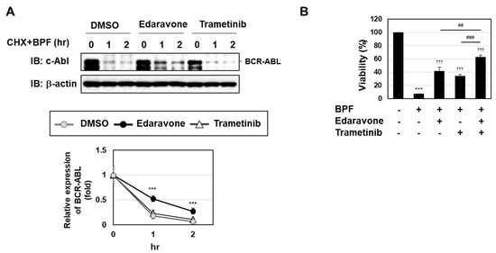 We previously reported that BPF induced the degradation of BCR-ABL partially through ROS generation [20]. We herein investigated whether the enhanced activation of the MEK-ERK pathway was involved in the BPF-induced degradation of BCR-ABL. In the presence of the protein synthesis inhibitor cycloheximide (CHX), BPF markedly induced the degradation of BCR-ABL. This degradation of BCR-ABL was significantly prevented by the treatment with edaravone, but not trametinib (Figure 5A). These results suggest that the BPF-induced activation of the MEK-ERK pathway was not involved in the degradation of BCR-ABL. We also examined the effects of a co-treatment with edaravone and trametinib on BPF-induced K562 cell death. As shown in Figure 5B, the co-treatment with edaravone and trametinib attenuated BPF-induced K562 cell death significantly more than the treatment with edaravone or trametinib alone. Therefore, BPF appeared to induced cell death via two pathways, ROS generation and the activation of the MEK-ERK pathway.