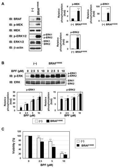 To further investigate the role of the MEK-ERK pathway in BPF-induced cell death, we established K562 cells stably expressing a constitutively active mutant of BRAF (BRAFV600E), which was previously shown to be expressed in melanomas and induced the constitutive activation of its downstream MEK-ERK pathway [24]. The expression of BRAFV600E induced the phosphorylation of MEK and ERK in K562 cells under serum-starved conditions (Figure 6A). The treatment with BPF increased the phosphorylation level of ERK in both control K562 cells and K562 cells expressing BRAFV600E (Figure 6B). Although the viability of K562 cells was not affected by the expression of BRAFV600E under serum-starved conditions, its expression significantly increased the sensitivity of cells to BPF (Figure 6C).