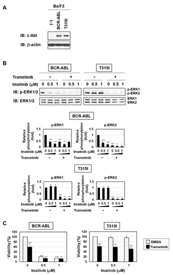 BPF has been shown to inhibit cell transformation by BCR-ABL with or without the gatekeeper mutation (T315I), partially through ROS generation [20]. Therefore, we herein examined whether BPF induced apoptosis in cells resistant to BCR-ABL inhibitors through the activation of the MEK-ERK pathway using Ba/F3 cells expressing BCR-ABL and the T315I mutant. The treatment with imatinib inhibited the phosphorylation of ERK in Ba/F3 cells expressing BCR-ABL, but not in Ba/F3 cells expressing BCR-ABL and the T315I mutant. On the other hand, the treatment with trametinib markedly inhibited the phosphorylation of ERK in both cells (Figure 7A,B). Imatinib induced apoptosis in Ba/F3 cells expressing BCR-ABL, but not in those expressing the T315I mutant, while trametinib reduced the viability of Ba/F3 cells expressing BCR-ABL and those expressing the T315I mutant. Furthermore, the co-treatment with trametinib enhanced imatinib-induced cell death in Ba/F3 cells expressing BCR-ABL, but not in those expressing the T315I mutant (Figure 7C).
