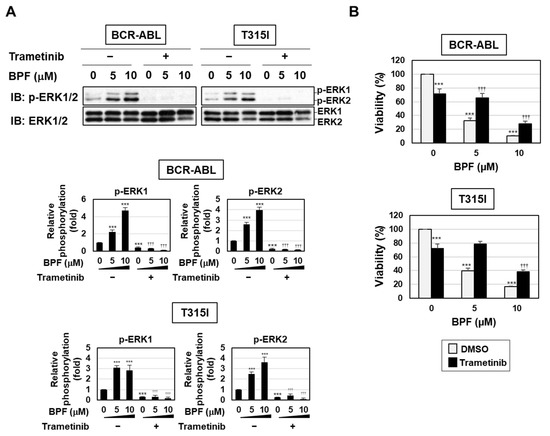 On the other hand, BPF enhanced the phosphorylation of MEK and ERK in Ba/F3 cells expressing BCR-ABL and those expressing the T315I mutant, and this was inhibited by the treatment with trametinib (Figure 8A). BPF effectively induced cell death to a similar extent in Ba/F3 cells expressing BCR-ABL and those expressing the T315I mutant. In addition, BPF-induced cell death in both Ba/F3 cell types was significantly attenuated by the treatment with trametinib (Figure 8B). These results suggest that BPF induced cell death, even in imatinib-resistant cells, through the enhanced activation of the MEK-ERK pathway.