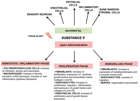There are many studies indicating that Substance P is involved in tissue regeneration, although the underlying mechanisms have not been fully understood. In damaged tissue, SP is released by sensory nerve fibers and inflammatory cells [32,33,34,35]. SP interacts directly and indirectly with NK1R on nerves, epithelial cells, and inflammatory cells such as mast cell, macrophages, and T lymphocytes to execute its functions in skin repair and regeneration. These functions include stimulation of the production of many cytokines (including those mentioned above) and growth factors important for wound healing [19,36]. Figure 1 and Table S1 in the Supplementary Materials summarize the effect of SP on different phases of wound healing.