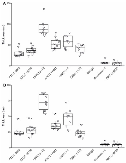 Thickness of the exosporium in Clostridium botulinum spores. The exosporium thickness of 10 spores of each purifiable strain was measured in three projections per spore. (A) The average thickness and (B) the minimum measured thickness of the exosporia were plotted in a scatter plot and boxplot combination to show both data density and distribution. UN1/10-7B was the only strain significantly different from others (p < 0.01).