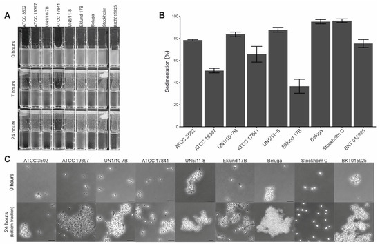 We tested spore autoaggregation by allowing the spore suspensions to sediment. While all spore suspensions eventually sedimented at the bottom of the cuvette, spores capable of autoaggregating were expected to attach to each other and sedimented faster. Active autoaggregation was observed in Group I strains UN1/10-7B and UN5/11-8, Group II Beluga, and Group III BKT015925. Spore suspensions from these strains sedimented in less than 6 to 7 h and had high sedimentation values from 96% to 84% (Figure 6A,B). Using phase contrast microscopy, we observed autoaggregation in these strains (Figure 6C). Other strains did not display autoaggregation. Instead, their spore suspensions displayed passive sedimentation with long periods to clear the suspensions (Figure 6A), lower sedimentation values (78% to 51%, 37% for Eklund 17B—Figure 6B), and an absence of autoaggregation (Figure 6C).
