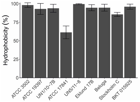 We studied the hydrophobicity of C. botulinum spores with the BATH assay [33], measuring the adhesion of purified spores to hexadecane by monitoring the decrease of OD440nm in aqueous solution. Most strains had hydrophobic spores with hydrophobicity values varying from 86% to 100%, with the only outlier being ATCC 17841 (61%, Figure 7).