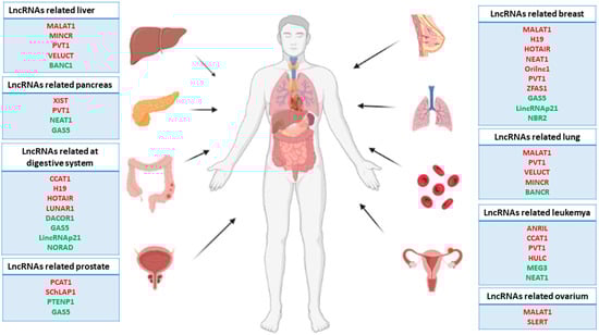 Representative scheme of the main human carcinomas and related lncRNAs. Note that the red lncRNAs act as oncogenes, while the green lncRNAs act as tumor suppressor genes.
