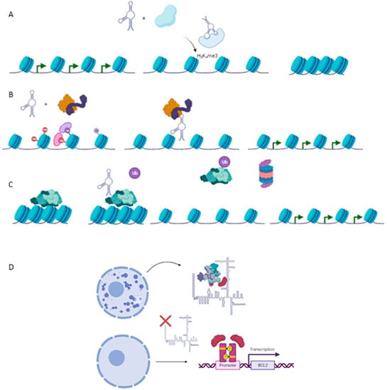 Cancer’s underlying epigenetics has been widely studied, given its pivotal role in the initiation, progression, and metastasis of most types of cancer, as well as its potential as a target for different gene therapies [35,36,37]. Epigenetics can be defined as the set of modifications that alters the structure or state of chromatin, differentially regulating its gene expression without changes in the DNA sequence [38]. Epigenetic alterations can be included in two basic groups. The first is modifications in the DNA, basically produced by the addition of methyl groups at the 5′ end of certain cytosines located in the so-called CpG islands, where long stretches of CG dinucleotides harbor the promoter regions of the genome that present high, precise, and intense gene regulation [39]. Methylation of the cytosines prevents binding of the transcription factors to the promoter regions, which results in gene repression. Interestingly, many types of cancer display a specific pattern of hyper-methylated CpG islands in several tumor suppressor gene promotors, inhibiting their expression and leading to an increase in different subpopulation cancer cells and thus enhanced tumor development [40,41,42]. The second group is modifications in the histone tail, essentially caused by methylation, acetylation, or phosphorylation of certain lysines located in the N-terminal region of histones 3′, altering the nucleosome charge, affecting the chromatin state, and thus allowing or preventing the recruitment of transcriptional co-activators to it [43]. These modifications are carried out by chromatin remodeling complexes that add open or close marks to the genome, making it accessible to the transcriptional machinery [44]. Unlike the hyper-methylation of the CpG islands, in many types of cancer, hypo-methylation of the genome is observed, leading to ectopic activation of specific oncogenes, whose expression is inhibited in homeostatic conditions. Ectopic activation of these oncogenes is essential for the cell to acquire an oncogenic phenotype and escape from cellular control systems [45,46]. In the same way, some of these chromatin remodeling complexes show enhanced or reduced activity in malignant cells, which leads to dysregulation in the chromatic structure, promoting the expression of genes that enhance tumor development [47,48,49].