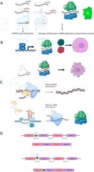 Main regulatory mechanisms of lncRNAs at the post-transcriptional level. (A) Competing sponge lncRNAs act to form an lncRNA-miRNA complex, avoiding the degradation of 3′UTR target genes, therein repressing the translation of them. (B) lncRNAs binding mRNA targets and avoiding the ribosome-initiated translation process. In sharp contrast, the mRNA-lncRNA complex attenuates the binding of repressed protein translation. (C) lncRNAs can act as positive modulators of rRNA synthesis, increasing the ribosome pool necessary for the increased protein demand in cancer cells. (D) lncRNAs can modulate the splicing process, leading to transcription of different isoforms that exert pivotal roles in several carcinomas.