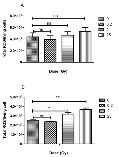 The amount of ROS produced by irradiated and non-irradiated PLB-985 cells (in Hank’s buffer) was measured using chemiluminescence assay at 40 min after irradiation. The experiments were started using horseradish peroxidase (10 µg/mL) and L-012 probe (10 µM) in 96-well microplates without adding any activator and lasted for 2 h. The areas under the chemiluminescence curves (Figure S1) were normalized with the number of cells in each sample (Sham: 436,250 cells/mL; 0.2 Gy: 438,750 cells/mL; 2 Gy; 346,250 cells/mL; 25 Gy; 282,500 cells/mL). The results are shown in Figure 2A. Irradiated or non-irradiated neutrophil-like cells produced low level of ROS, with no significant statistical difference.
