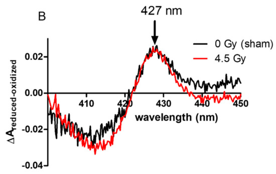 Dithionite reduced minus oxidized Soret band (427 nm) of membrane fractions purified (A) from irradiated (0.2 Gy) and non-irradiated PLB cells. (B) Irradiated neutrophil membrane fractions. The measured solution contained 100 µL of membrane fractions from surviving cells, 2 fold diluted and solubilized in 1% Dodecylmaltoside (DDM) in a quartz cuvette. The reference cuvette contained a similar solution. The reduced form was obtained by adding 1 mg of sodium dithionite to the sample cuvette after taking the oxidized spectrum. Observations were made with 2 or more independent preparations.