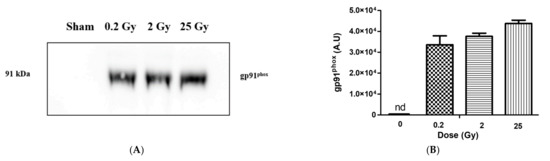 Presence of gp91phox in membrane fractions from irradiated and non-irradiated PLB cells. (A) Western blot of membrane fractions (gp91phox). Lane 1: 0 Gy (non-irradiated PLB-cells), lane 2, 3 and 4 represent PLB cells irradiated at 0.2 Gy, 2 Gy and 25 Gy, respectively. In each lane, 20 µg of total membrane proteins (determined from BCA assay) was deposited. The membrane fractions were heated for 5 min at 85 °C, and subject to 10% SDS-PAGE and immunoblotting. Each membrane was incubated with a primary antibody (dilution 1:1500 for gp91phox). (B) Band intensity of gp91phox quantified by densitometry using ImageJ software (Java 1.8.0). nd represent non-determined. The Figure is a representation of 2 independent preparations.