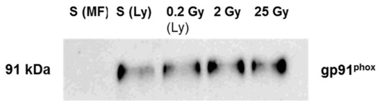 Gp91phox detection in total lysate of irradiated and non-irradiated PLB cells. S(MF) represents the membrane fraction from sham (non-irradiated PLB-cells); S(Ly) represent the total cell lysate of sham; subsequent lanes (Ly) represents the total lysate of PLB cells irradiated at 0.2 Gy, 2 Gy and 25 Gy, respectively. In each lane, 20 µg of total membrane proteins (estimated from BCA assay) was deposited. The membrane fractions were heated for 5 min at 85 °C, and subject to 10% SDS-PAGE and immunoblotting. Each membrane was incubated with a primary antibody (dilution 1:1500 for gp91phox). MF: Membrane fractions, Ly: lysate.