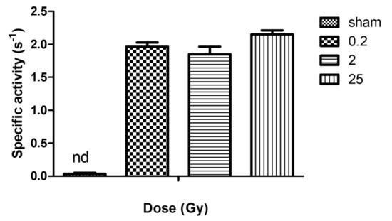 Specific activity of NADPH oxidase from irradiated and non-irradiated PLB-985 cells. Superoxide production was determined in vitro using membrane fractions purified from irradiated (4 nM cytb558) surviving PLB-985 cells mixed with purified cytosolic fractions from each preparation (250 µg each) and incubated in activity buffer (PBS solution supplemented with 10 mM MgSO4) for 5 min in the presence of AA (40 μM). NADPH (200 μM) was added to initiate the reaction and 50 μM of cyt c to measure superoxide rate of production. The activity was calculated from the initial rate of reaction at 550 nm using an extinction coefficient of 21 M−1 cm−1. Specific activity indicates the amount of superoxide produced per second per mole of cytb558 of NADPH oxidase. Data are the mean ± SEM of 3 independent experiments. nd represents non-determined for the non-irradiated sample.