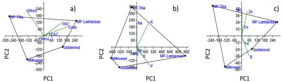 Three groups of parameters—color with antioxidant assays, macroelements, microelements—were selected for PCA in order to establish their identification power in terms of honey types. The results are presented in the biplots of Figure 2.
