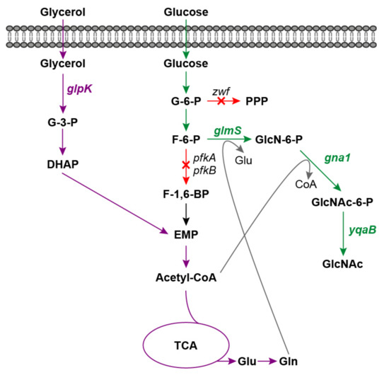 Traditionally, GlcNAc is produced through chemical and enzymatic hydrolysis of crustacean shells [6,7]. However, there are several drawbacks to these extraction processes, such as the limitation of raw material supply and severe environmental pollution. Moreover, GlcNAc is difficult to extract from crab and shrimp shells without allergenic risk for individuals who suffer from shellfish allergies. In recent years, microbial production of GlcNAc has drawn tremendous attention, as it is a promising alternative to the production of non-shellfish-derived GlcNAc in a low-cost and environmentally compatible manner [8,9,10]. Several microorganism species have been evaluated for GlcNAc production, including Escherichia coli [11], Bacillus subtilis [12], Saccharomyces cerevisiae [13], Lactobacillus plantarum [14] and Corynebacterium glutamicum [15]. The biosynthesis pathway of GlcNAc from the precursor fructose-6-phosphate (F-6-P) involves three crucial enzymes, glucosamine-6-phosphate synthase (GlmS), glucosamine-6-phosphate N-acetyltransferase (GNA1) and GlcNAc-6-phosphate phosphatase (Figure 1). Various metabolic engineering strategies have been applied to improve GlcNAc production and the current efforts are focused largely on enhancing the GlcNAc biosynthesis pathway through key enzyme screening and overexpression, deleting by-product biosynthetic pathways, blocking catabolism of intracellular GlcNAc and engineering transcription factors [15,16,17]. The key precursor for GlcNAc biosynthesis is F-6-P, which is also an essential intermediate for the Embden-Meyerhof-Parnas pathway (EMP). Furthermore, sufficient supplies of glutamine and acetyl-CoA, which act as amino and acetyl donors, are also important for GlcNAc production (Figure 1). Therefore, modulation of the balance between cell growth and GlcNAc biosynthesis is crucial for high-level GlcNAc production. However, there are relatively few studies focusing on this strategy, which may limit the further improvement of microbial production of GlcNAc.