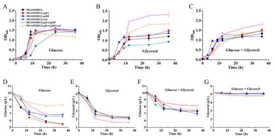 The glucose and glycerol consumptions of different MG1655(DE3) mutants on various media are given in Figure 2D–G. Although the triple-deletion mutant MG1655(DE3)∆pfkA∆pfkB∆zwf could grow on a glucose medium, the glucose consumption was significantly lower than those of the wild-type strain and the single- or double-deletion mutants (Figure 2D), which would result in the intracellular accumulation of F-6-P. As expected, the presence of glucose inhibited the consumption of glycerol for the MG1655(DE3) wild-type strain and three single-deletion mutants via carbon catabolite repression. In contrast, the carbon catabolite repression was mildly alleviated for mutants MG1655(DE3)∆pfkA∆pfkB and MG1655(DE3)∆pfkA∆pfkB∆zwf with 0.33 and 0.45 g/L glycerol consumed, respectively, when glucose and glycerol were used in a mixed carbon source (Figure 2F,G). This phenomenon coincides with the result reported by Shiue and co-workers that significantly reduced glucose transportation and utilization in the cell would result in the alleviation of carbon catabolite repression [22]. However, only a small amount of glycerol was consumed in our mixed-carbon-source fermentation. This might be because mutants MG1655(DE3)∆pfkA∆pfkB and MG1655(DE3)∆pfkA∆pfkB∆zwf still have a weak glucose-utilization ability.