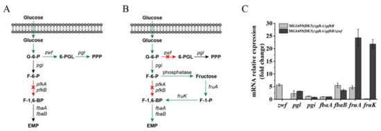 Gene expression and glucose utilization patterns of MG1655(DE3)∆pfkA∆pfkB and MG1655(DE3)∆pfkA∆pfkB∆zwf cultivated in M9s+glucose medium. Schematic diagrams of proposed glucose utilization patterns of (A) MG1655(DE3)∆pfkA∆pfkB and (B) MG1655(DE3)∆pfkA∆pfkB∆zwf (F-1-P bypass); (C) qPCR results showing the mRNA expression of genes related to G-6-P, F-6-P and F-1,6-BP metabolism in MG1655(DE3)∆pfkA∆pfkB and MG1655(DE3)∆pfkA∆pfkB∆zwf. 6-PGL, 6-phosphogluconolactone; pgl, 6-phosphogluconolactonase gene; F-1-P, fructose-1-phosphate; pgi, glucose-6-phosphate isomerase gene; fruA, fructose-specific PTS multiphosphoryl transferase gene; fruK, 1-phosphofructokinase; fbaA, fructose-bisphosphate aldolase gene (class 2); fbaB, fructose-bisphosphate aldolase gene (class 1).