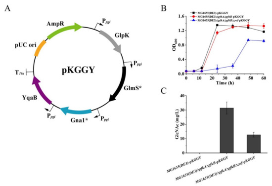 E. coli has a native biosynthetic pathway of GlcNAc, which is used for the synthesis of peptidoglycan and lipopolysaccharide, the essential components of the cell wall of the E. coli strain. However, the synthetic pathway for GlcNAc in E. coli is tightly regulated. Therefore, the glmS* gene from E. coli [29], gna1* gene from Caenorhabditis elegans [30] and yqaB gene (GlcNAc-6-phosphate phosphatase) from E. coli [17] were selected for overexpression under the control of the native pgi promoter to convert F-6-P to GlcNAc. Although carbon catabolite repression was alleviated for mutants MG1655(DE3)∆pfkA∆pfkB and MG1655(DE3)∆pfkA∆pfkB∆zwf, glycerol consumption was still restricted in the presence of glucose (Figure 2F,G). To achieve high GlcNAc production by synergetic fermentation of glucose and glycerol, the glycerol utilization pathway must be further enhanced. Glycerol kinase (GlpK) catalyzes the phosphorylation of glycerol to yield glycerol-3-phosphate (G-3-P), which is the rate-limiting step in glycerol utilization. Thus, the glpK gene from Pichia pastoris GS115 (a well-known glycerol utilization organism) was chosen for overexpression to enhance glycerol utilization in the presence of glucose. Plasmid pKGGY harboring glpK, glmS*, gna1* and yqaB expression cassettes was then constructed based on the pEASY-T3 mother vector (Figure 4A) and introduced into the MG1655(DE3) wild-type strain, MG1655(DE3)∆pfkA∆pfkB and MG1655(DE3)∆pfkA∆pfkB∆zwf, generating mutants MG1655(DE3)-pKGGY, MG1655(DE3)∆pfkA∆pfkB-pKGGY and MG1655(DE3)∆pfkA∆pfkB∆zwf-pKGGY, respectively.