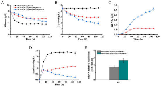 Batch fermentation profiles of MG1655(DE3)-pKGGY, MG1655(DE3)∆pfkA∆pfkB-pKGGY and MG1655(DE3)∆pfkA∆pfkB∆zwf-pKGGY grown in M9s+glucose+glycerol medium supplemented with 10% LB. (A) Glucose consumption; (B) glycerol consumption; (C) GlcNAc production; (D) acetic acid production; (E) qPCR results showing the mRNA expression of the acs gene.