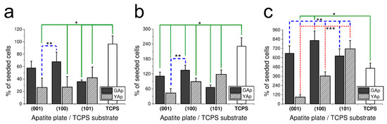 The fibroblast-cell growth-rate (calculated as a percentage of seeded cells) on apatite plates compared with TCPS substrate after 48 h (a), 3 days (b) and 5 days (c) of incubation. The number of cells seeded was 500 cells/mm2 in the case of (a) and 200 cells/mm2 in the case of (b,c). * Significant difference (p < 0.05) compared with TCPS control (continuous line). ** Significant difference (p < 0.05) between (001) YAp and remaining apatite plates (dashed line). *** Significant difference (p < 0.05) between (100) YAp and three other apatite plates: (001), (101) YAp and (100) GAp (dotted line). The bar graphs represent the mean ± SD of three independent experiments.