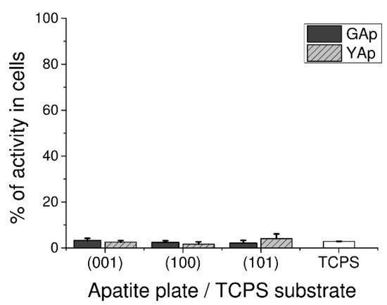 For all tested surfaces, the percentage of alive cells in population was very high (with no differences between GAp and YAp sets of plates at p < 0.05 and between the apatite plates and TPCS at p < 0.05). Only cells grown on (101) YAp had slightly lower percentage of alive cells in population than TPCS (significantly different at p < 0.05). The number of apoptotic/necrotic cells grown on this surface was low and comparable to the corresponding samples (with no differences between GAp and YAp plates at p < 0.05 as well as between the sets of apatite plates and TPCS at p < 0.05) (Figure 3).