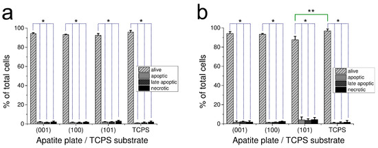 Effect of GAp (a) and YAp (b) apatite plates after 48 h of incubation on fibroblast apoptosis and necrosis. Control cells were grown on TPCS. The number of alive, apoptotic, late apoptotic or necrotic cells are expressed as the percentage of total cells that were grown on the plate of particular crystallographic orientation. The values are expressed as a mean percentage of three independent experiments with standard deviation. * Significant difference (p < 0.05) between alive and dead cells (dotted line). ** Significant difference (p < 0.05) between the alive cells of (101) YAp and TCPS (continuous line).