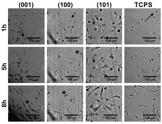 In order to assess if there are any differences in the fibroblast attachment during cell culture settlement between (001), (100) and (101) apatite plates as well as TCPS substrates, the morphology of cells cultured on GAp plates was documented using time-laps inverted microscopy (see Figure 4). It was observed that the process of cell–surface interactions on all tested apatite plates was similar to that on TCPS. However, the common feature of fibroblasts performing on all apatite plates was enhanced migration of cells compared to the migration of cells interacting with TCPS. One hour after cell seeding, fibroblasts were either polarized or stretched/spindle-shaped, and their morphology was typical for the early stage of the settlement. Additionally, the various stages of mitosis were observed (the representative cells during cytokinesis were marked with asterisks on Figure 4), both after 5 h and 8 h of incubation, indicating intensive cell division on apatite plates similar to that on TCPS.