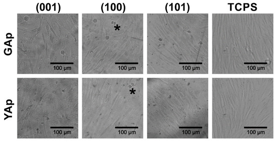 The microscopic observations after 48 h of incubation revealed variability in the morphology of the fibroblasts and in the cell density on each type of the apatite plate (Figure 5). On GAp (001) plate, the fibroblasts had a tendency to be stretched and arranged in a disordered way. By contrast, on GAp (100) and (101) plates (Figure 5, second and third photographs in the first row, respectively) the shape of the cells was regular and elongated, which is typical for fibroblasts observed in cell culture on TCPS (Figure 5, last column). The cells were well spread in one direction and mutually aligned. The similar cell arrangement was observed on all tested YAp plates (see Figure 5, second row).