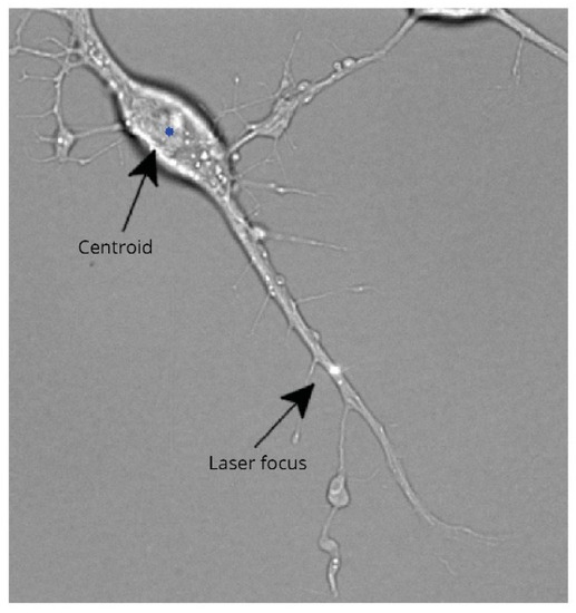 Laser-induced transection injury of an axon. Image showing a laser beam focused on neurite extension from a differentiated RGC-5 cell. Laser pulse was set to 7.5 nJ at 76 MHz, with exposure of 5 s (reproduced with permission from Santiago Costantino, Department of Ophthalmology, University of Montreal, Canada, PLoS ONE; 2011, 6(11), e26832.